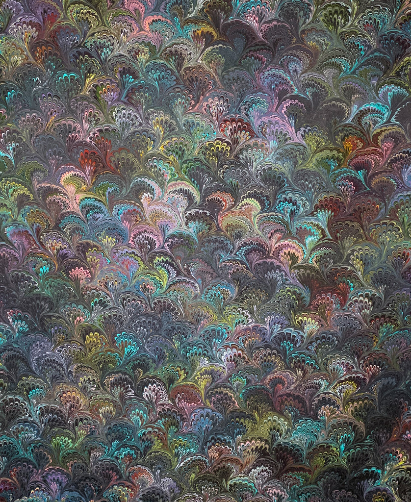 Large hand-marbled peacock design on black medium weight charmeuse silk, great for jacket linings or that special project. 43" x 110".