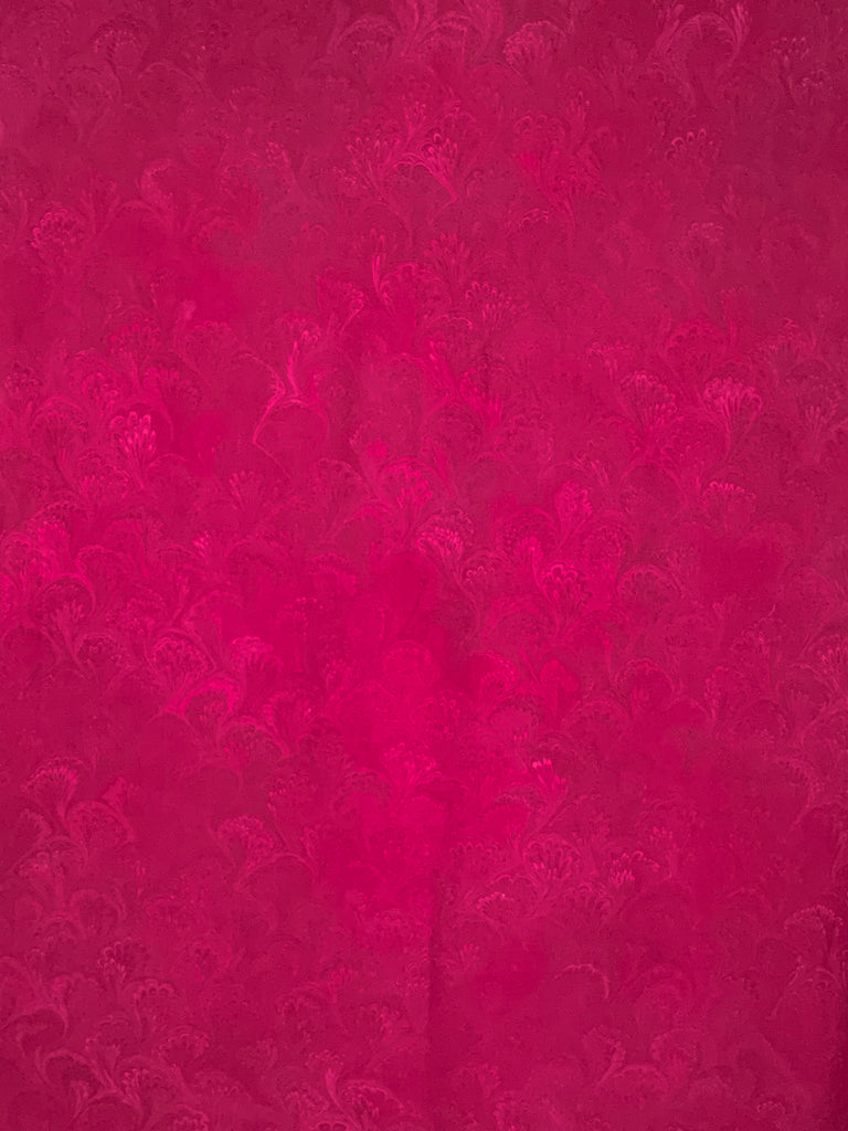 Large hand-marbled peacock design on burgundy medium weight charmeuse silk, great for jacket linings or that special project. 43" x 110".