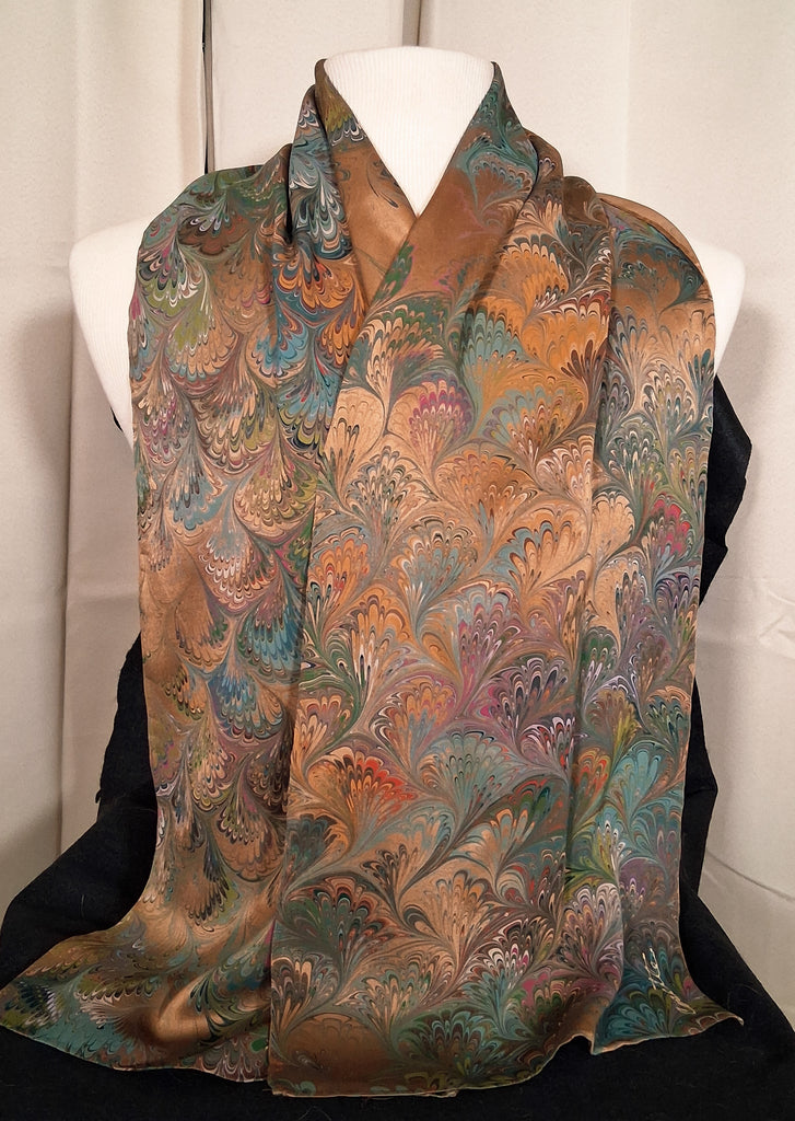 Brown scarf in peacock design. 100% charmeuse silk, medium weight. 11" x 53". Hand wash or machine wash delicate with like colors, air dry or machine dry. Iron on back side if needed.