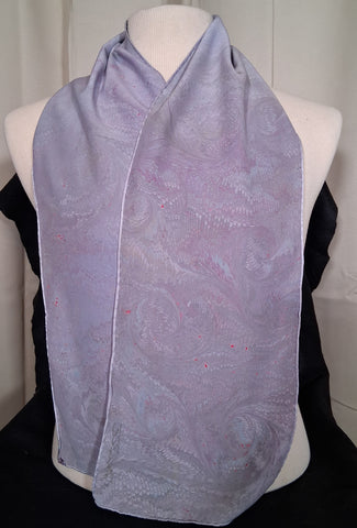 Lavender scarf in abstract circle design. 100% charmeuse silk, medium weight. 8" x 50". Hand wash or machine wash delicate with like colors, air dry or machine dry. Iron on back side if needed.