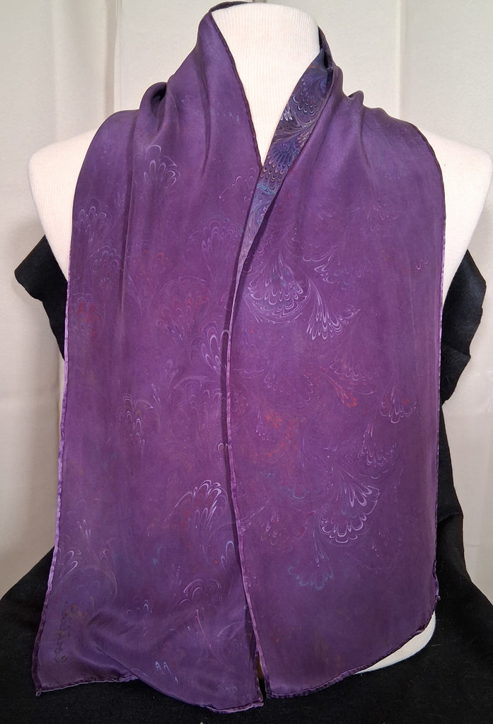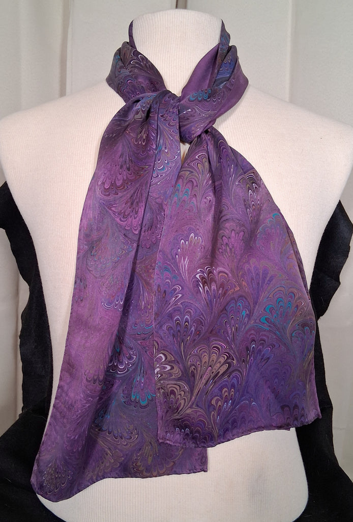 Purple scarf in peacock design. 100% charmeuse silk, medium weight. 8" x 50". Hand wash or machine wash delicate with like colors, air dry or machine dry. Iron on back side if needed.