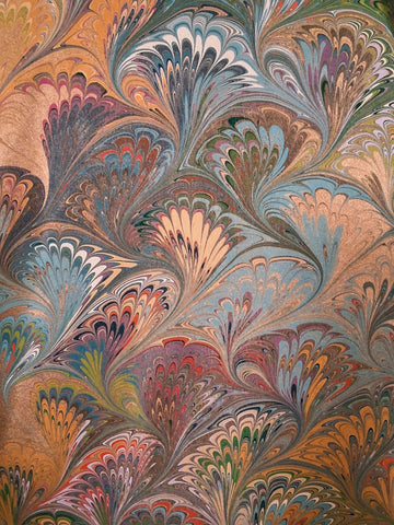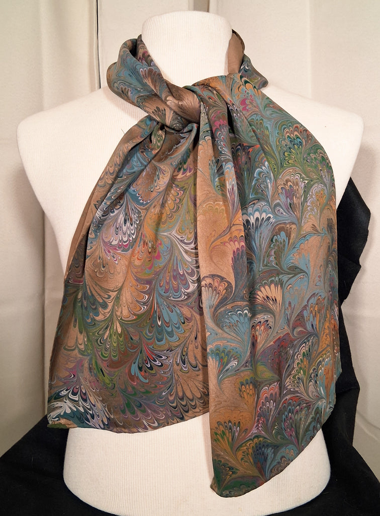 Tan scarf in peacock design. 100% charmeuse silk, medium weight. 11" x 53". Hand wash or machine wash delicate with like colors, air dry or machine dry. Iron on back side if needed.
