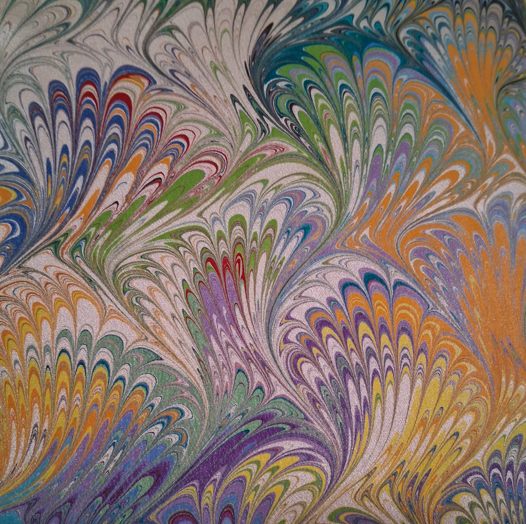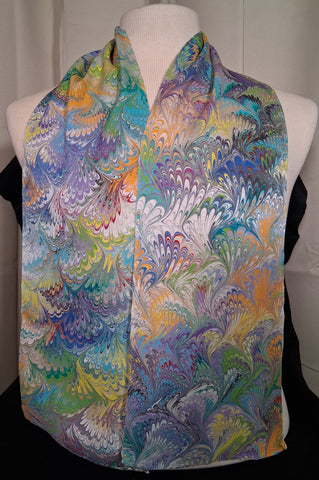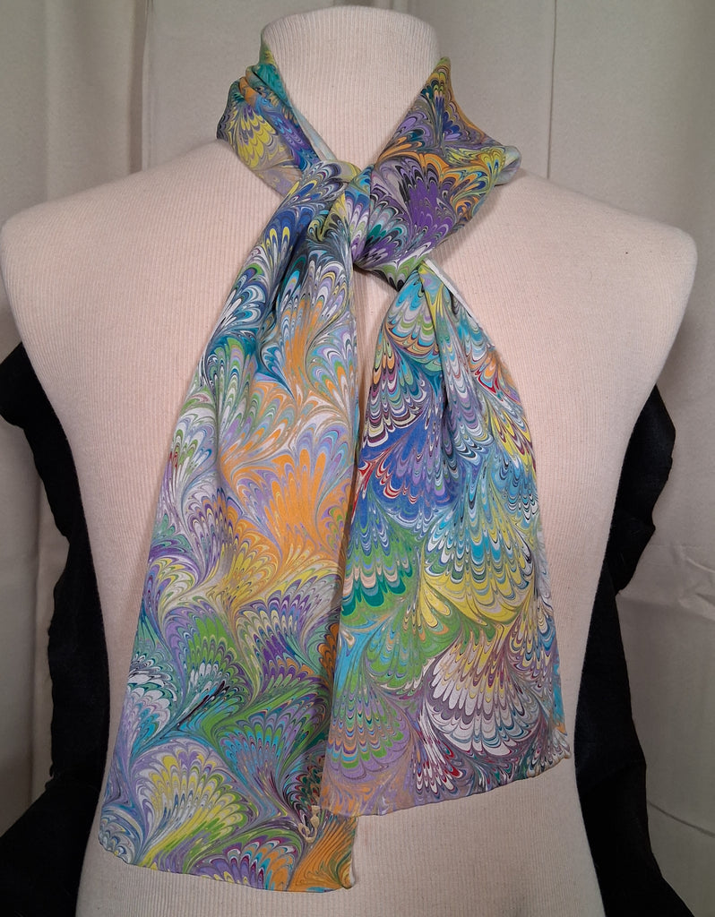 White scarf in peacock design. 100% charmeuse silk, medium weight. 8" x 50". Hand wash or machine wash delicate with like colors, air dry or machine dry. Iron on back side if needed.